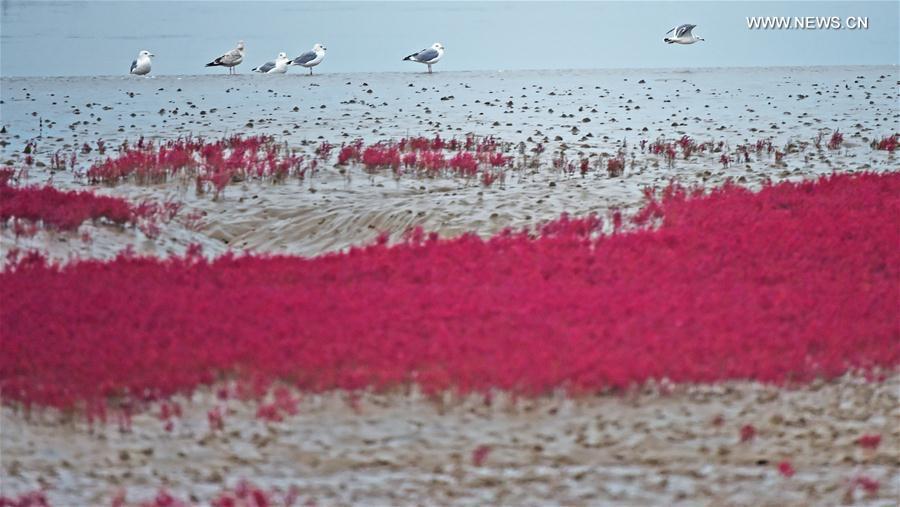 Seagulls are seen on the red beach in Zhangjiacun village of Dayou Township, Linghai City, northeast China's Liaoning Province, Oct. 24, 2016. The red beach is covered by the suaeda salsa. (Xinhua/Yang Qing)