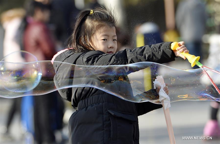 A young girl plays with bubbles on a warm winter day in Zhongshan Park in Yinchuan, capital of northwest China's Ningxia Hui Autonomous Region, Nov. 27, 2016. (Xinhua/Peng Zhaozhi)