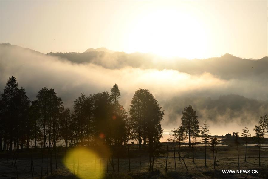 Photo taken on Nov. 28, 2016 shows fog-enveloped Qishu Lake in Yixian County of Huangshan City, east China's Anhui Province. (Xinhua/Chen Yehua)