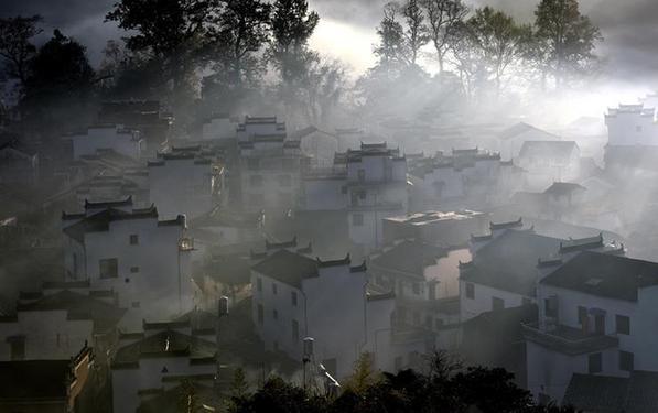 Early morning fog scenery of Shicheng Village in east China's Wuyuan
