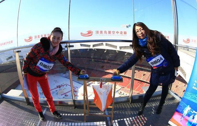 Runners take part in a race along the walkways on the roof of the National Stadium, also known as the Bird's Nest, in Beijing on Saturday, February 11, 2017. The newly renovated walkways have been extended from 200 to 1,000 meters in length, to cover the whole roof from south to north. The Bird's Nest has become the first Olympics main stadium in the world to opens its entire roof surface to the public. (Photo/people.cn)