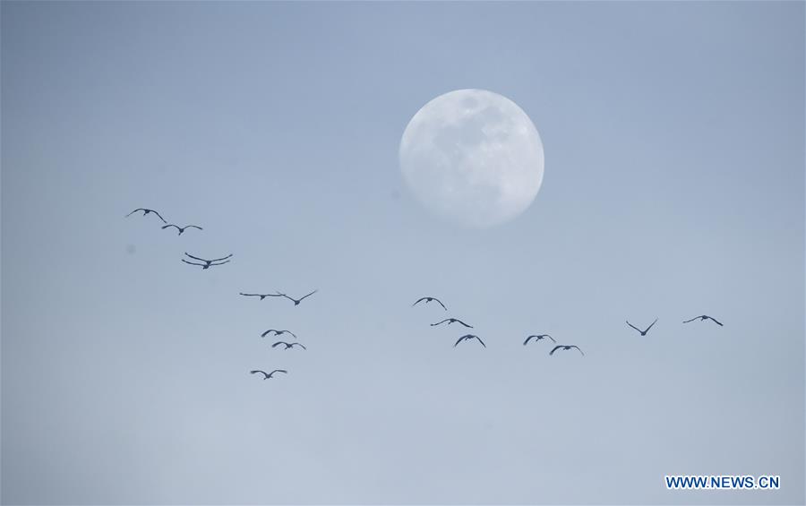 Swans fly over the lakeside of the Guanting reservoir in suburban Beijing, capital of China, March 11, 2017. Migratory birds passed by here and took a rest on their flyway to the north. (Xinhua/Li Xin)
