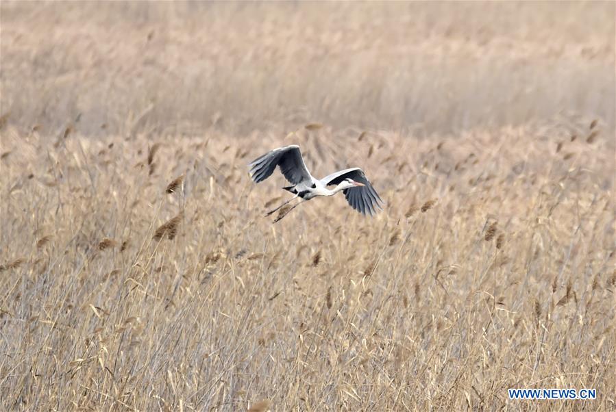 Migratory birds fly over wetland in suburban Beijing