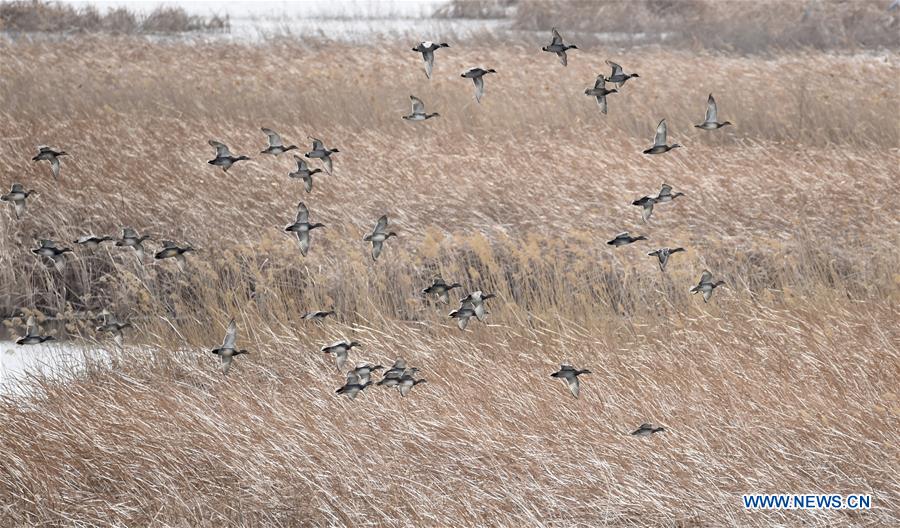 Swans fly over the lakeside of the Guanting reservoir in suburban Beijing, capital of China, March 11, 2017. Migratory birds passed by here and took a rest on their flyway to the north. (Xinhua/Li Xin)