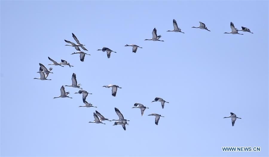 Swans fly over the lakeside of the Guanting reservoir in suburban Beijing, capital of China, March 11, 2017. Migratory birds passed by here and took a rest on their flyway to the north. (Xinhua/Li Xin)