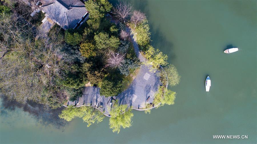 Aerial photo taken on March 11, 2017 shows spring scenery of Baohe Park in Hefei, capital of east China's Anhui Province. (Xinhua/Guo Chen)