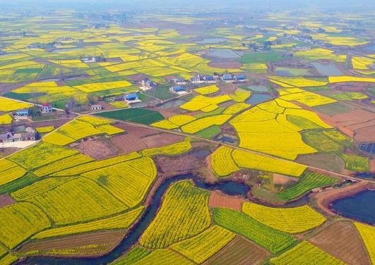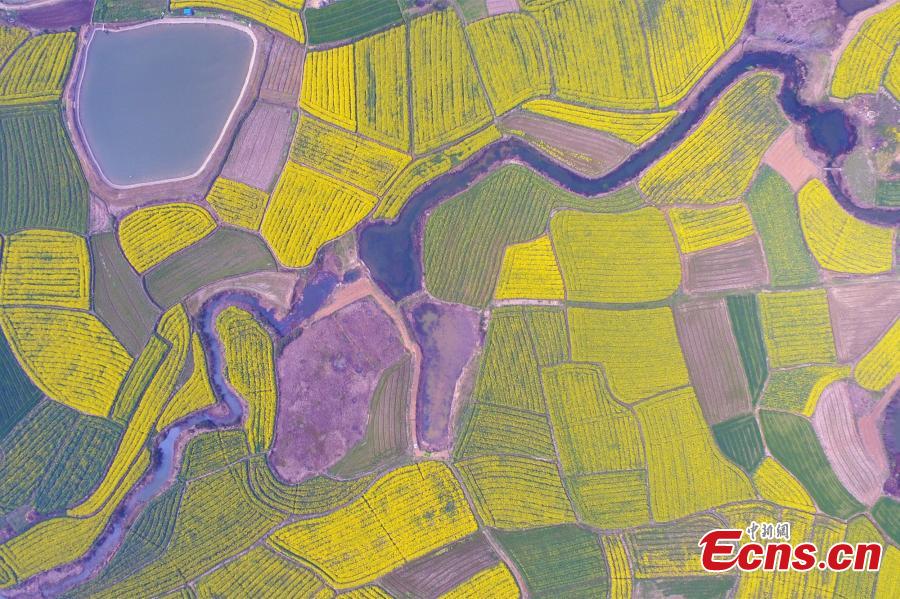 An aerial view of rapeseed flowers in Wenan Township, Zhijiang City, Central China’s Hubei Province, March 9, 2017. The beautiful flowers across plots of land have attracted many visitors.