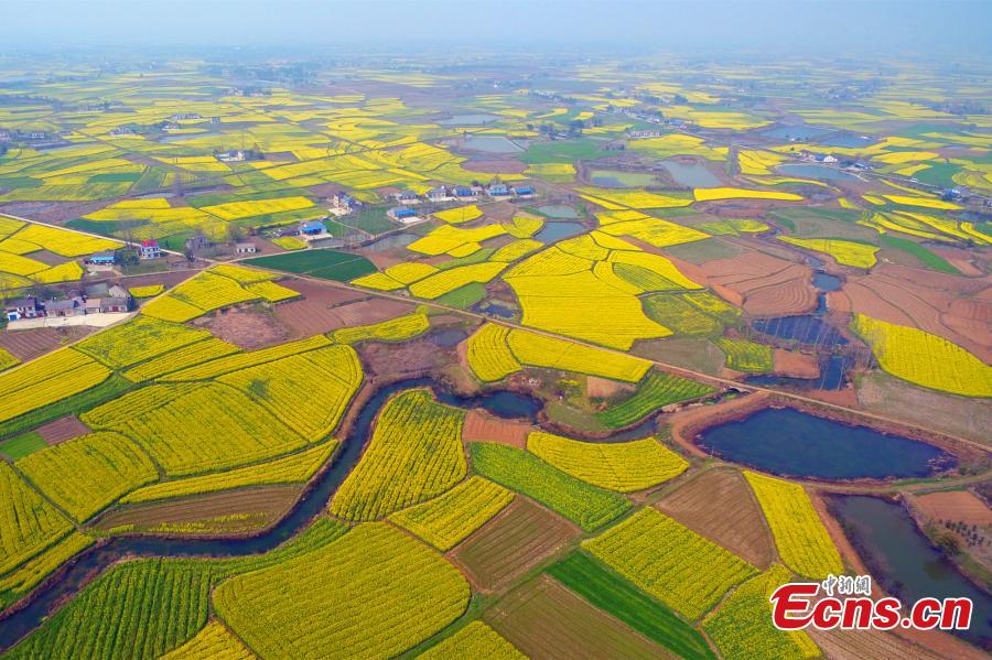 An aerial view of rapeseed flowers in Wenan Township, Zhijiang City, Central China’s Hubei Province, March 9, 2017. The beautiful flowers across plots of land have attracted many visitors. (Photo: China News Service/Zhou Xingliang)