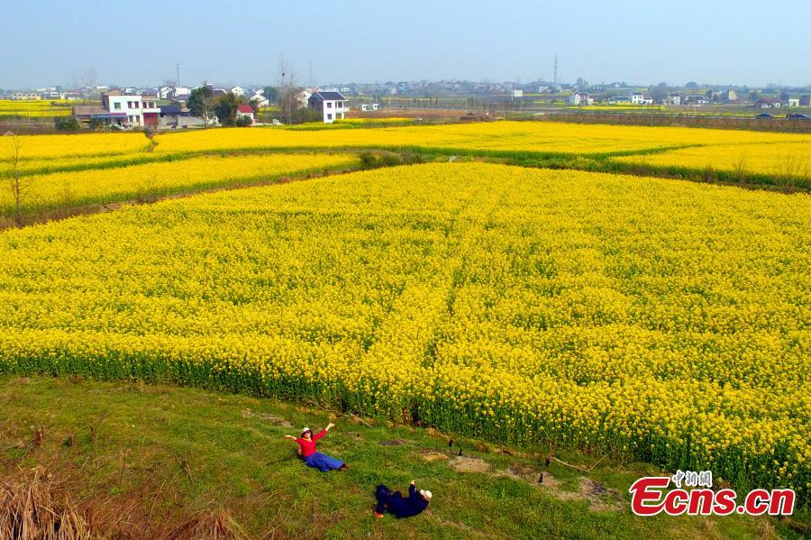 An aerial view of rapeseed flowers in Wenan Township, Zhijiang City, Central China’s Hubei Province, March 9, 2017. The beautiful flowers across plots of land have attracted many visitors.