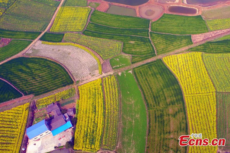 An aerial view of rapeseed flowers in Wenan Township, Zhijiang City, Central China’s Hubei Province, March 9, 2017. The beautiful flowers across plots of land have attracted many visitors. (Photo: China News Service/Zhou Xingliang)