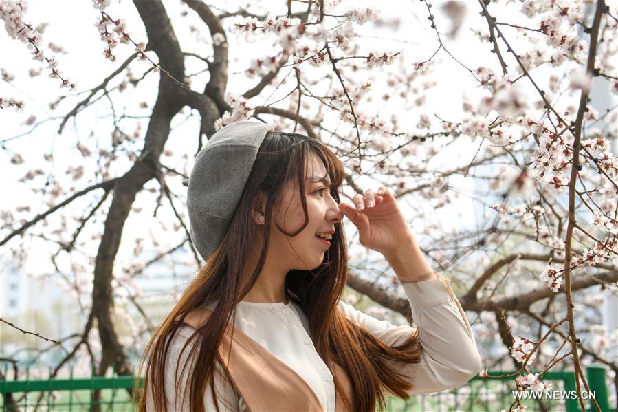 A young woman poses for photos under apricot blossoms at Harbin Engineering University in Harbin, capital of northeast China's Heilongjiang Province, April 25, 2017. (Xinhua/Wang Song)
