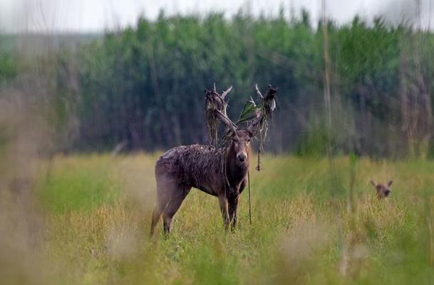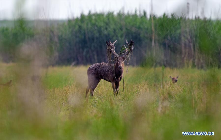 A milu deer is seen in a state nature reserve near Dongting Lake, central China's Hunan Province, May 10, 2017. Staff with Hunan Provincial Forestry Department found 62 wild milu deer during a drone inspection in a state nature reserve near Dongting Lake, the second-largest freshwater lake in China. It is the biggest group of wild milu deer ever seen in the area. The population of wild milu deer in Dongting Lake area has surpassed 120. (Xinhua/Li Ga)