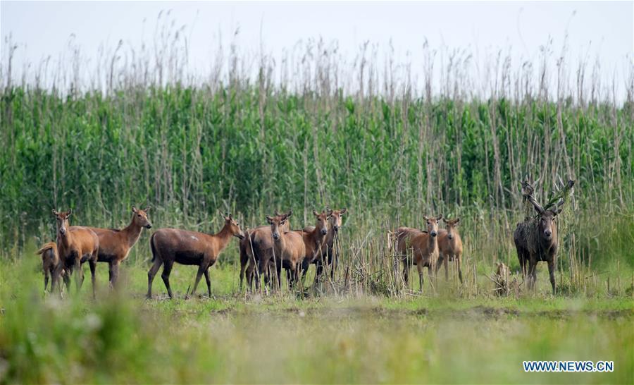 A group of milu deer are seen in a state nature reserve near Dongting Lake, central China's Hunan Province, May 10, 2017. Staff with Hunan Provincial Forestry Department found 62 wild milu deer during a drone inspection in a state nature reserve near Dongting Lake, the second-largest freshwater lake in China. It is the biggest group of wild milu deer ever seen in the area. The population of wild milu deer in Dongting Lake area has surpassed 120. (Xinhua/Li Ga)