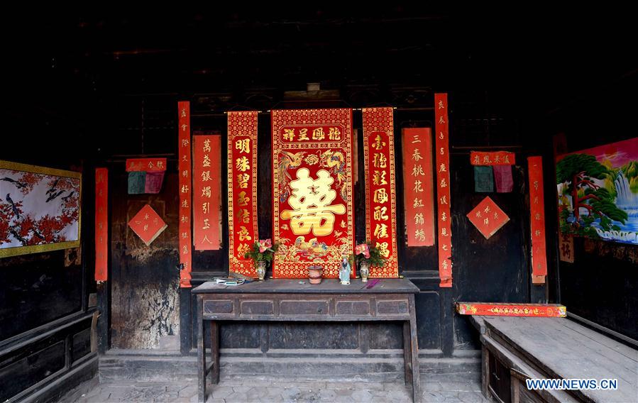 Photo taken on May 13, 2017 shows the interior scene of a residential house built on the mountain slope in Nuodeng Village, Yunlong County, southwest China's Yunnan Province. Nuodeng ancient village, located in the valley to the north of Yunlong County, reserves numerous ancient buildings and cultural heritages of the Ming (1368-1644) and Qing (1644-1911) dynasties. Over 200 families of Bai ethnic group reside in the ancient village. (Xinhua/Yang Zongyou)