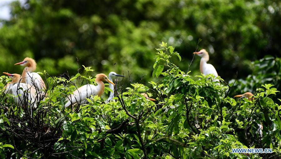 Cattle egrets rest on branches in Mingxi County, southwest China's Fujian Province, on May 16, 2017. (Xinhua/Mei Yongcun)