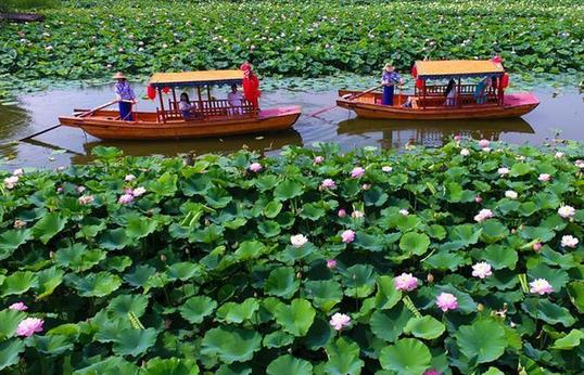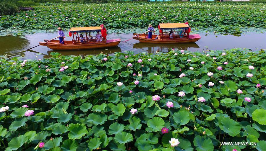 Visitors admire lotus flowers at a wetland park in Zaozhuang City, east China's Shandong Province, June 13, 2017. (Xinhua/Gao Qimin)
