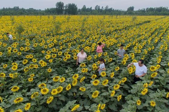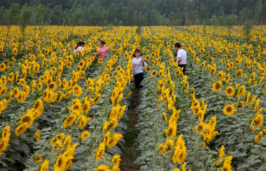 Tourists walk in the oil sunflower field in Zhaoxi Village of Zhaoqiao Township in Wuyi County, north China's Hebei Province, June 13, 2017. (Xinhua/Zhu Xudong)