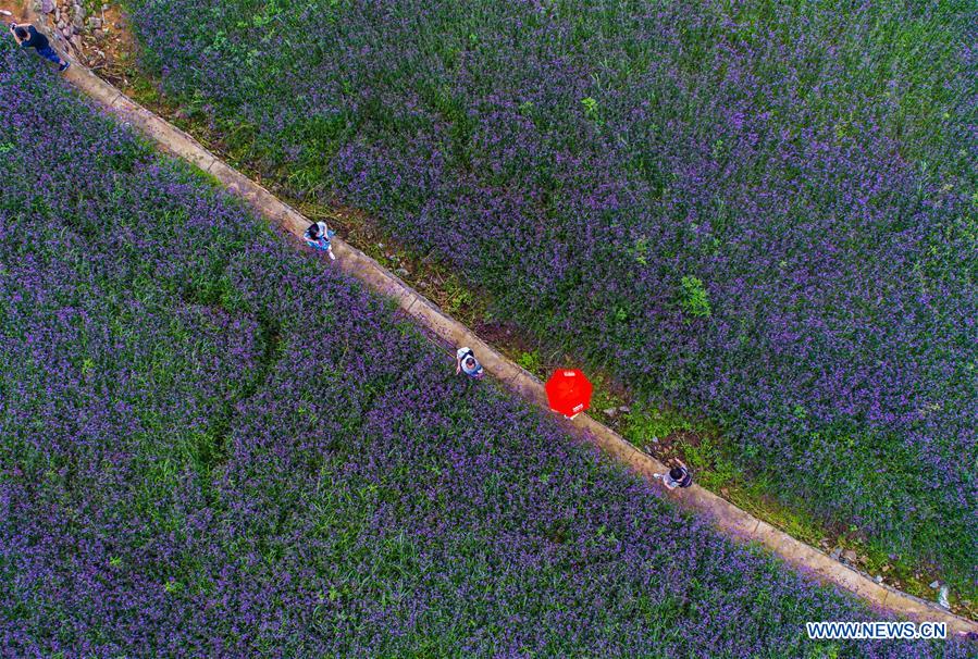 Aerial photo taken on July 2, 2017 shows the sea of vervain in terraced fields in Tangbu Village of Hangzhou, capital of east China's Zhejiang Province. Vervain bloom in a valley of the village, forming a purple sea of flowers here and attracting lots of visitors. (Xinhua/Xu Yu)