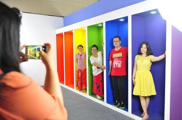 Visitors pose for photos during a photo studio exhibition in Beijing, capital of China, July 1, 2017. More than 100 shooting scenes and more than 200 lights are set during the exhibition, with which people can create their own photos. The exhibition will last until October. (Xinhua/Xiao Xiao)