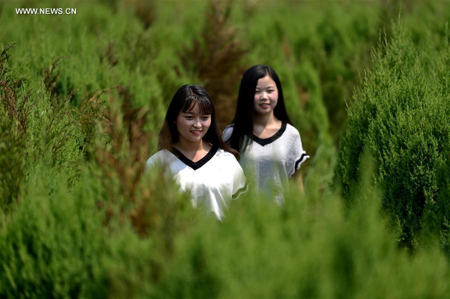 Tourists walk in a maze at a Hongshigou ecological leisure farm in Shahe City, north China's Hebei Province, June 30, 2017. A maze that consists of 7000 trees and covers an area of more than 3000 square meters were set up at the farm in Shahe City recently, which attracted many tourists. (Xinhua/Chen Lei)