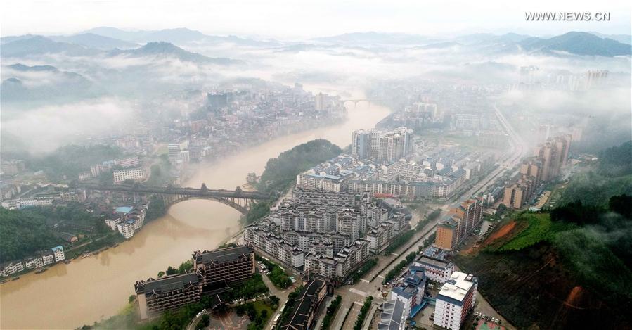 The fog cloaks Wind and Rain Bridge in Sanjiang Dong Autonomous County in Liuzhou, south China's Guangxi Zhuang Autonomous Region, June 30, 2017. (Xinhua/Gong Pukang)