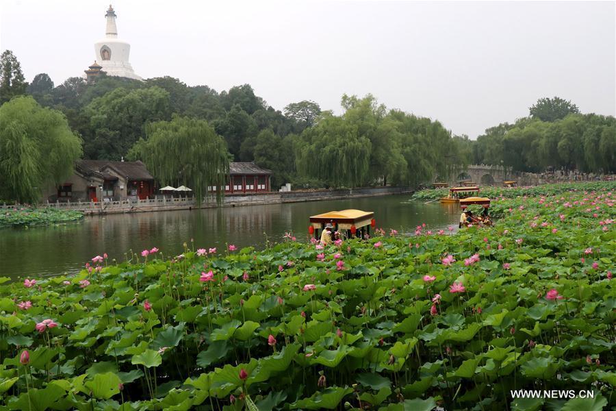 Tourists take sightseeing boats to view lotus flowers at Beihai Park in Beijing, capital of China, July 4, 2017. (Xinhua/Wang Xibao)