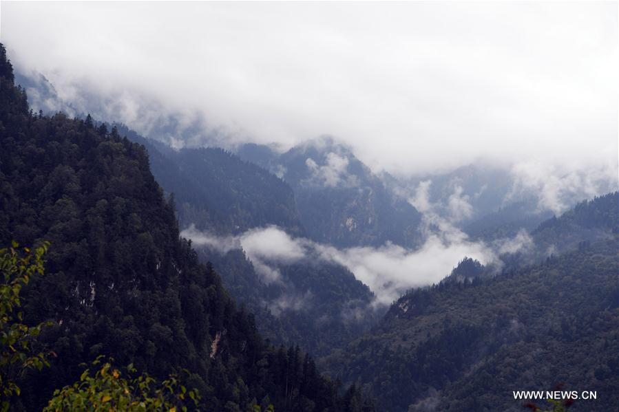 Aerial photo taken on Sept. 19, 2017 shows the scenery of Guanegou National Forest Park at Dangchang County in Longnan City, northwest China's Gansu Province. (Xinhua/Liu Chan)