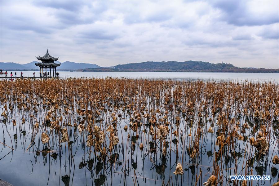 Withered lotus are seen at the West Lake scenic spot in Hangzhou, capital of east China's Zhejiang Province, Dec. 13, 2017. (Xinhua/Xu Yu)