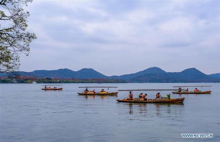 Tourists sail in the West Lake scenic spot in Hangzhou, capital of east China's Zhejiang Province, Dec. 13, 2017. (Xinhua/Xu Yu)