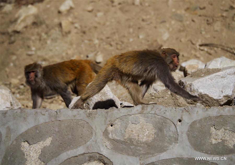 Tibetan macaques play at a gorge in Shannan, southwest China's Tibet Autonomous Region, Dec. 12, 2017. (Xinhua/Liu Dongjun)