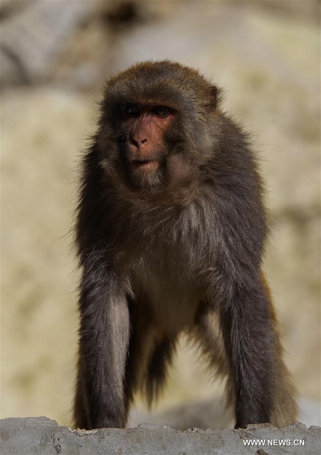 A Tibetan macaque plays at a gorge in Shannan, southwest China's Tibet Autonomous Region, Dec. 12, 2017. (Xinhua/Liu Dongjun)