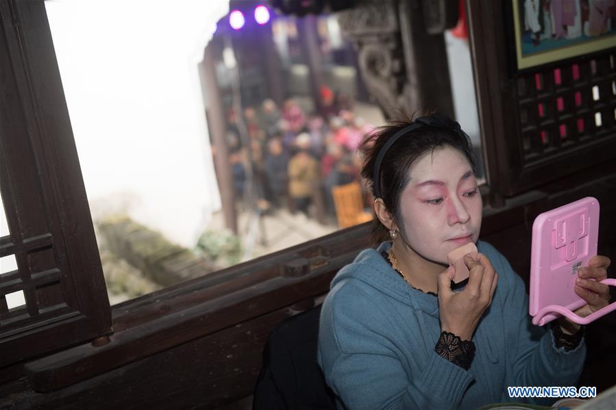 An actor of Xilu "luantan" wears make-up in Shiliping Village of Zhuji, east China's Zhejiang Province, Jan. 18, 2018. Xilu "luantan", which is popular with people in Zhuji and nearby areas, is a subtype of the "luantan" opera. The performance with exaggerating movements is based on dialect. In 2011, Xilu "luantan" was listed as one of the national intangible cultural heritages. (Xinhua/Weng Xinyang)