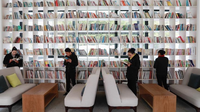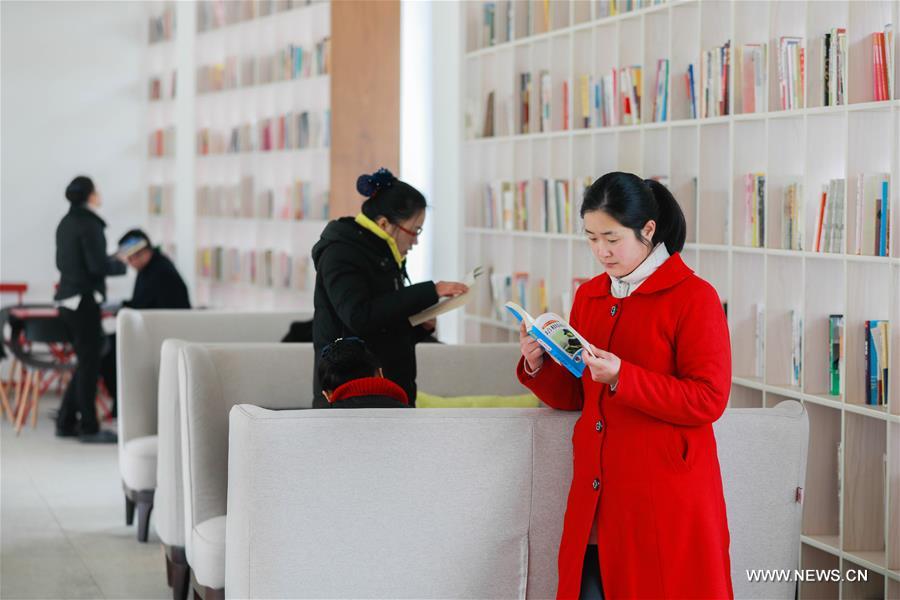 Tourists read books at a book bar in Xuyi County of Huai'an City, east China's Jiangsu Province, Jan. 21, 2018. The book bar in Tieshan Temple National Forest Park opened free to the public on Sunday with about 100,000 books available for tourists to read. (Xinhua/Zhou Haijun)