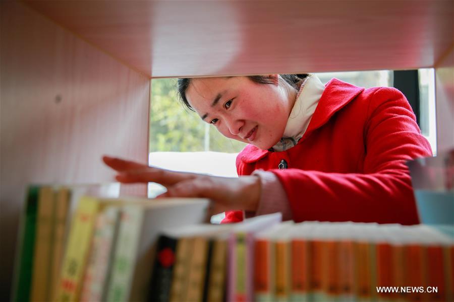 A tourist chooses books at a book bar in Xuyi County of Huai'an City, east China's Jiangsu Province, Jan. 21, 2018. The book bar in Tieshan Temple National Forest Park opened free to the public on Sunday with about 100,000 books available for tourists to read. (Xinhua/Zhou Haijun)