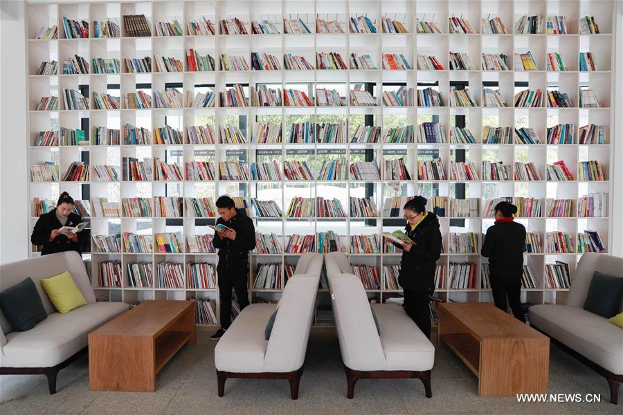 Tourists read books at a book bar in Xuyi County of Huai'an City, east China's Jiangsu Province, Jan. 21, 2018. The book bar in Tieshan Temple National Forest Park opened free to the public on Sunday with about 100,000 books available for tourists to read. (Xinhua/Zhou Haijun)