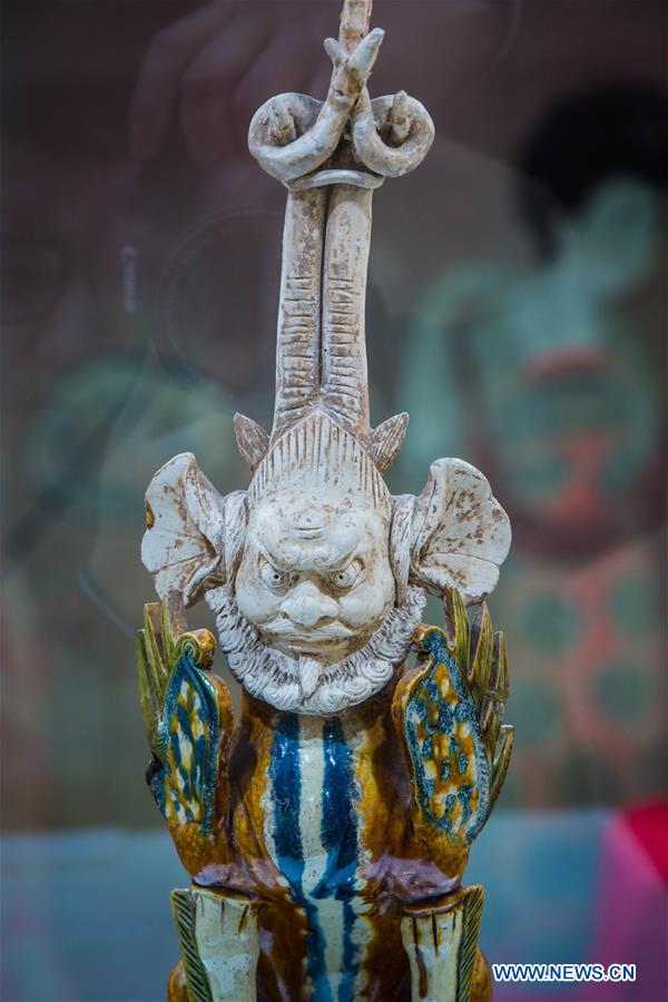 Photo taken on Feb. 7, 2018 shows tri-colored glazed pottery of China's Tang Dynasty (618-907) at the Hieronim Lopacinski Voivodeship Public Library in Lublin, Poland. The exhibition "Tri-colored glazed pottery of the Tang dynasty in Luoyang, China" is being held in Lublin and will last until this March. [Xinhua]