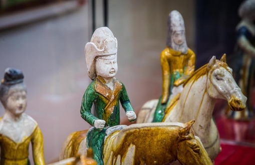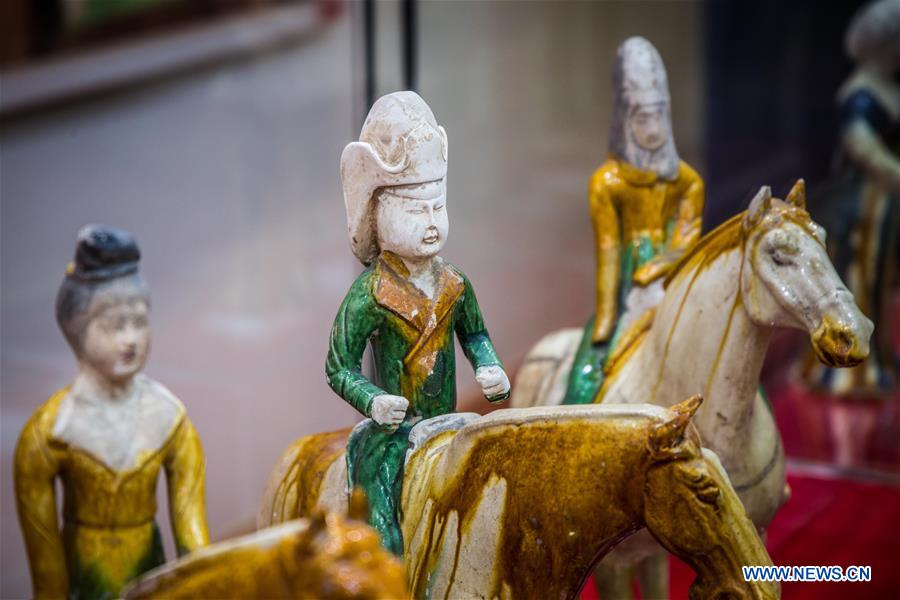 Photo taken on Feb. 7, 2018 shows tri-colored glazed pottery of China's Tang Dynasty (618-907) at the Hieronim Lopacinski Voivodeship Public Library in Lublin, Poland. The exhibition "Tri-colored glazed pottery of the Tang dynasty in Luoyang, China" is being held in Lublin and will last until this March. [Xinhua]