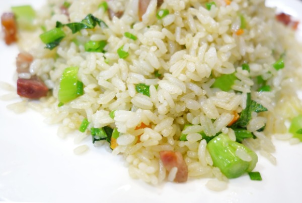 Add the stir-fried mixture to the rice and place in a rice cooker. Sprinkle with the quarter cup water and cook. After five minutes, add the caixin leaves.