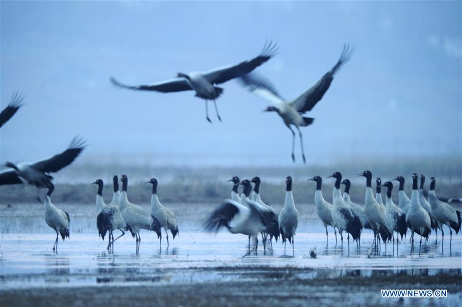 A flock of black-necked cranes are pictured in the Caohai lake in Weining County, southwest China's Guizhou Province, March 9, 2018. A state-level natural reserve, the Caohai lake in Guizhou is a major overwintering habitat for many migratory birds, most notably the black-necked cranes (Grus nigricollis). (Xinhua/Yang Wenbin)