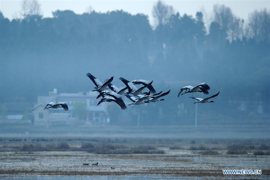 A flock of black-necked cranes fly over the Caohai lake in Weining County, southwest China's Guizhou Province, March 9, 2018. A state-level natural reserve, the Caohai lake in Guizhou is a major overwintering habitat for many migratory birds, most notably the black-necked cranes (Grus nigricollis). (Xinhua/Yang Wenbin)