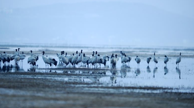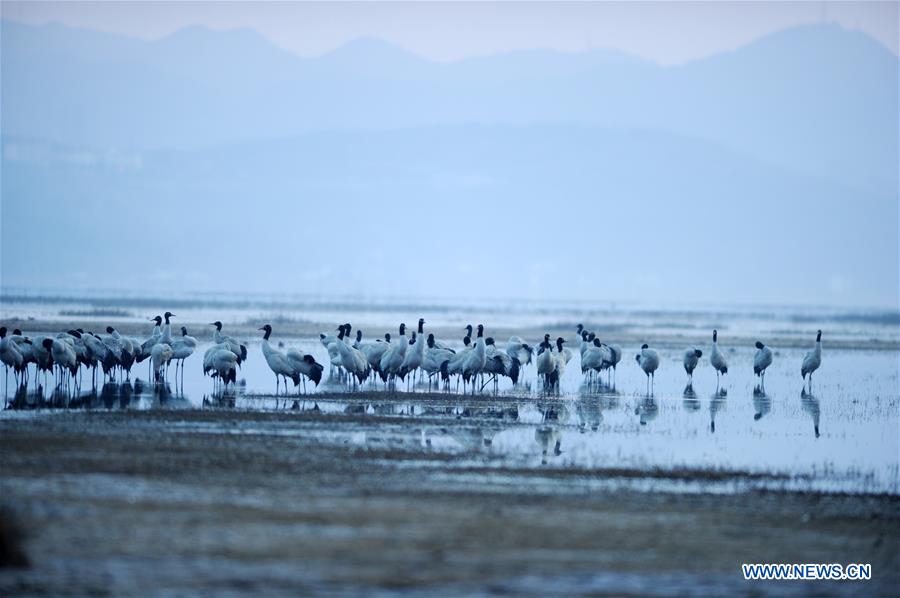A flock of black-necked cranes are pictured in the Caohai lake in Weining County, southwest China's Guizhou Province, March 9, 2018. A state-level natural reserve, the Caohai lake in Guizhou is a major overwintering habitat for many migratory birds, most notably the black-necked cranes (Grus nigricollis). (Xinhua/Yang Wenbin)