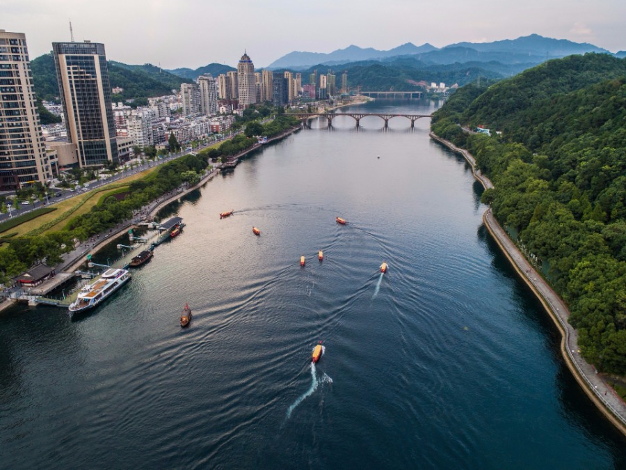 A drone captures a peaceful scene of tourist boats plying the Xinanjiang River in Jiande city, Anhui province, July 23, 2018. Despite the hot weather accompanying the arrival of peak summer, the water temperature in the river remains at around 17 ℃, bringing the whiff of cool respite. [Photo/Xinhua]