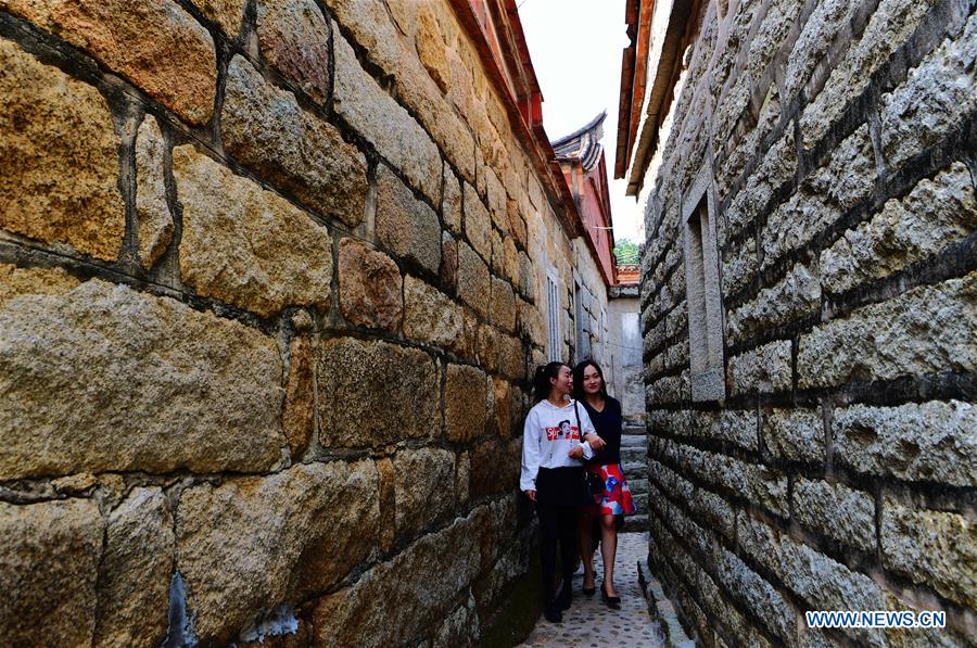 Tourists view the stone houses at Weishan Village of Hui'an County, southeast China's Fujian Province, Oct. 26, 2018. (Xinhua/Wei Peiquan)