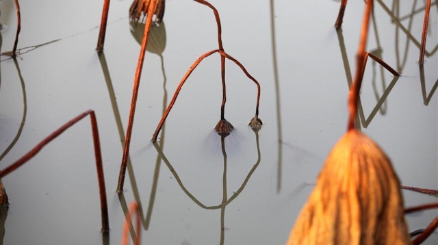 Photo taken on Nov. 13, 2018 shows withered lotus at the Slender West Lake scenic area in Yangzhou, east China's Jiangsu Province. (Xinhua/Meng Delong)