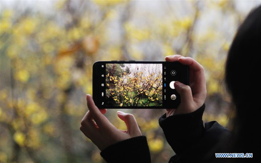 A tourist takes a picture of wintersweet blossoms at Shouxihu Lake scenic spot in Yangzhou City, east China's Jiangsu Province, Jan. 5, 2019. (Xinhua/Meng Delong)