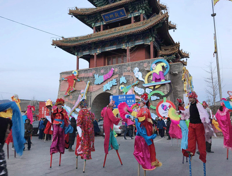 Performers play stilt walking at the Yongning temple fair. [photo by Guo Xiaohong / China.org.cn]