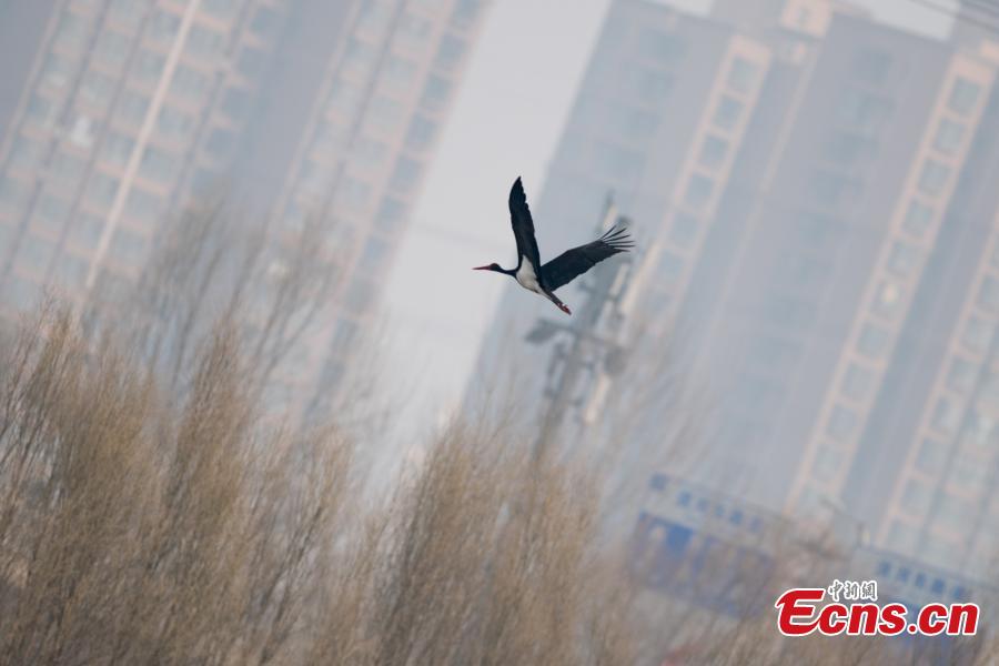 A black stork at a wetland park in Taiyuan City, North China's Shanxi Province, Feb. 25, 2019. The black stork is under first-class state animal protection in China. (Photo: China News Service/Wei Liang)