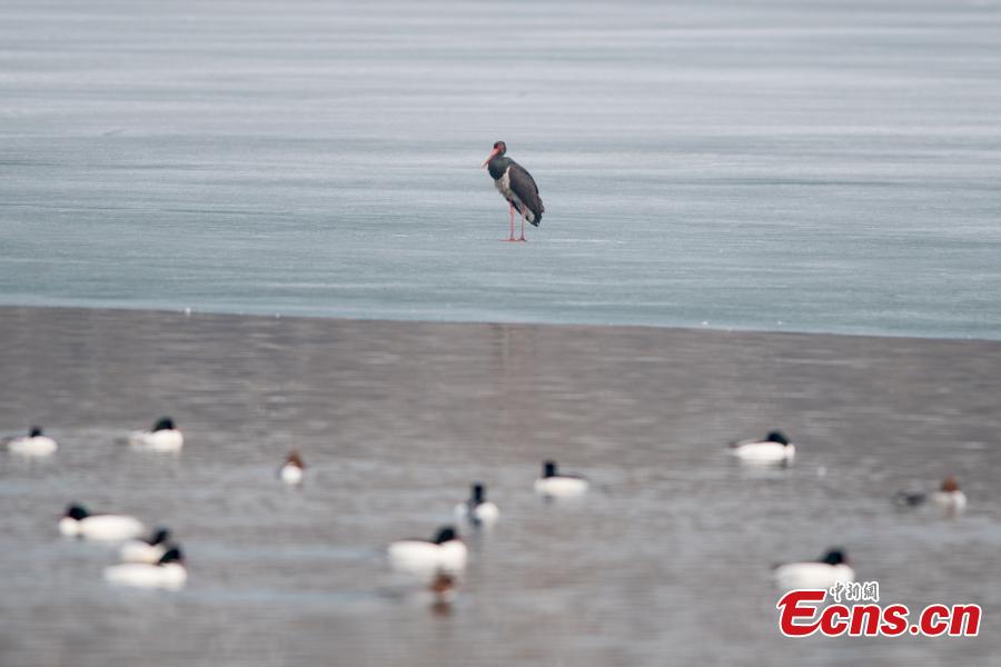 Black storks are seen at a wetland park in Taiyuan City, North China's Shanxi Province, Feb. 25, 2019. The black stork is under first-class state animal protection in China. (Photo: China News Service/Wei Liang)