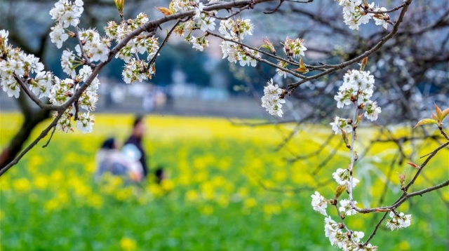 Tourists take pictures of plum blossoms at a park in Suzhou, east China's Jiangsu Province, March 3, 2019. People go outside to enjoy the scenery of flowers in blossom as temperature rises in many parts of China in early spring. (Xinhua/Hang Xingwei)