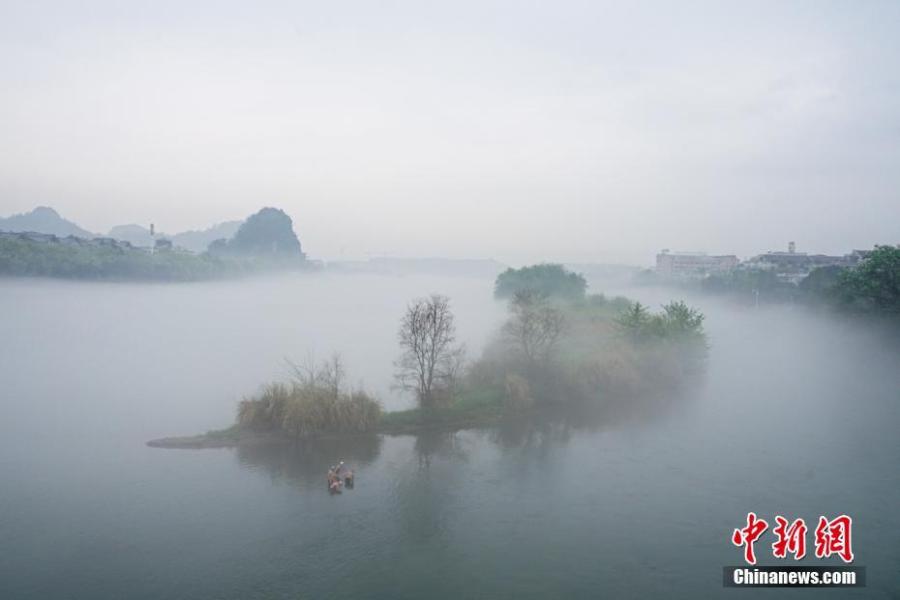 Downtown Guilin City covered in mist in Guangxi Zhuang Autonomous Region, March 28, 2019. Like a green ribbon flowing through the mountains, the Lijiang River is known for its amazing natural beauty. (Photo: China News Service/Tang Mengxian)